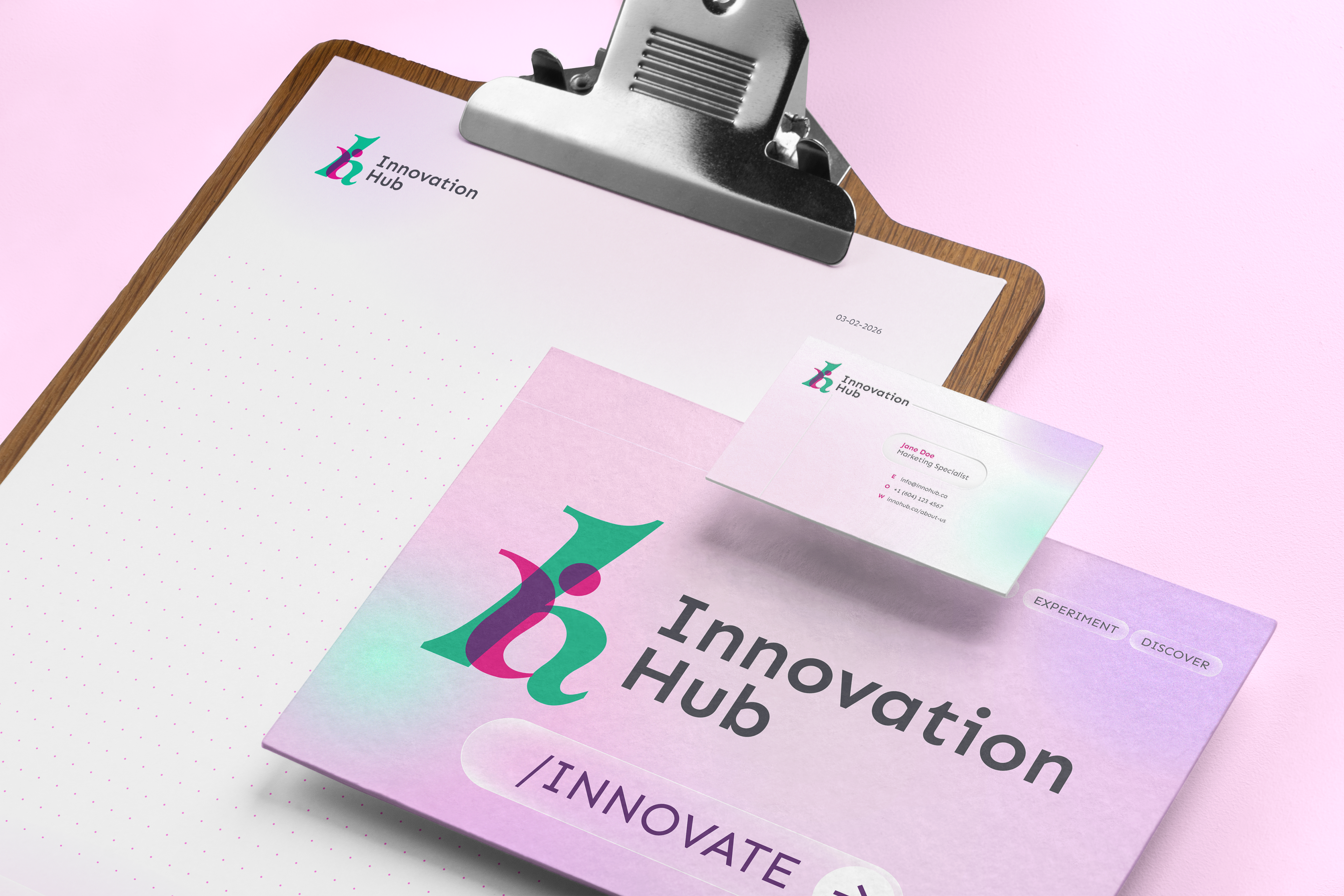The central asset of this brand, the logo, was created to spearhead its visual identity in celebration of the closing of its first cohort in 2024. It is a popping, vibrant representation of the Innovation Hub's values: fresh ideas, creative solutions, and collaboration.